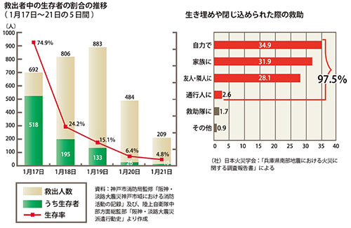 1995年の阪神・淡路大震災では、家屋の倒壊などによって生き埋めになったり、閉じ込められた人のうち、公助によって助けられた人は少なく、およそ98%は自力または家族、そして隣人などの地域住民によって救出されたのです。